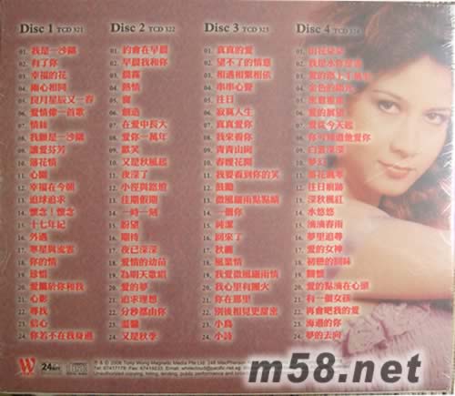 Disc 1 TCD 321 01. 我是一沙鷗 02. 有了你 03. 幸福的花 04. 兩心相同 05. 良月星辰又一春 06. 愛情像一首歌 07. 情絲 08. 我愿是一沙鷗 09. 讓愛芬芳 10. 落花情 11. 心園 12. 幸福在今朝 13. 追球追求 14. 懷念!懷念 15. 十七年紀 16. 外遇 17. 寒星與流云 18. 你的情 19. 珍惜 20. 愛屬于你和我 21. 心影 22. 尋找 23. 信心 24. 你若不在我身邊 Disc 2 TCD 322 01. 約會在早晨 02. 早晨我和你 03. 晨霧 04. 熱情 05. 窗 06. 創造 07. 在愛中長大 08. 愛你一萬年 09. 歡笑 10. 又是秋風起 11. 夜深了 12. 小徑與路燈 13. 佳期假期 14. 一時一刻 15. 盼望 16. 期待 17. 夜已深深 18. 愛情的幼苗 19. 為明天歌唱 20. 愛的夢 21. 追求理想 22. 分秒都由你 23. 溫馨 24. 又是秋季 Disc 3 TCD 323 01. 真真的愛 02. 望不了的情意 03. 相遇相系相依 04. 串串心聲 05. 往日 06. 寂寞人生 07. 真真愛你 08. 我來看你 09. 青青山崗 10. 春暖花開 11. 我要看到你的笑 12. 鼓勵 13. 微風細雨點點晴 14. 一個你 15. 純潔 16. 回來了 17. 秋纏 18. 楓葉情 19. 我愛微風細雨情 20. 我心里有團火 21. 你在那里 22. 別后相見更甜蜜 23. 小鳥 24. 小詩 Disc 4 TCD 324 01. 山花朵朵 02. 我是水你是云 03. 愛的路上千萬里 04. 金色的陽光 05. 蜜意重重 06. 愛的展望 07. 愛從今天起 08. 你可知道他愛你 09. 白云深深 10. 夢幻 11. 落花飄零 12. 往日痕跡 13. 深秋楓紅 14. 水悠悠 15. 滴滴春雨 16. 夢里追尋 17. 愛的女神 18. 初戀的回味 19. 關懷 20. 愛的點滴在心頭 21. 有一個女孩 22. 再會吧我的愛 23. 海邊的你 24. 夢的去向