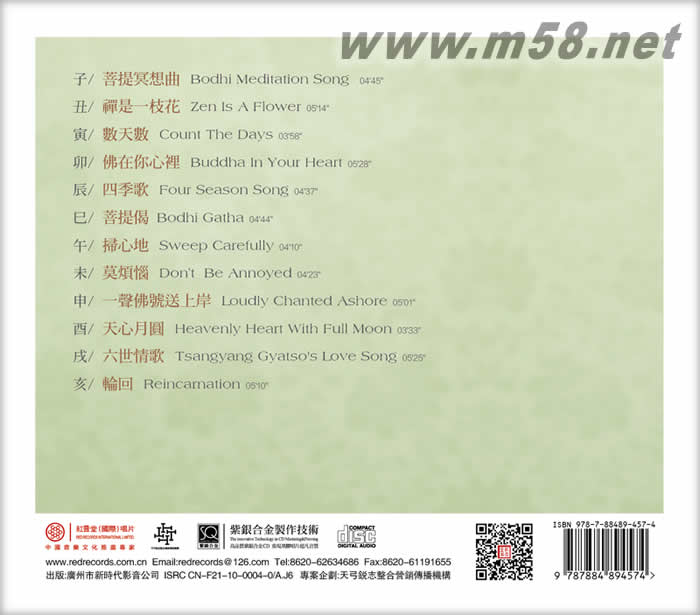 子 菩提冥想曲 04’42” Bodhi Meditation Song 丑 禪是一枝花 05’29” Zen Is a Flower 寅 數天數 03’58” Count the Days 卯 佛在你心里 05’23” Buddha in Your Heart 辰 四季歌 04’35” Four Season Song 巳 菩提偈 04’50” Bodhi Gatha 午 掃心地 04’28” Sweep Carefully 未 莫煩惱 04’28” Don’t be Annoyed 申 一聲佛號送上岸 04’58” Loudly Chanted Ashore 酉 天心月圓 03’32” Heavenly Heart with Full Moon 戌 六世情歌 05’30” Tsangyang Gyatso's love Song 亥 輪回 05’09” Reincarnation