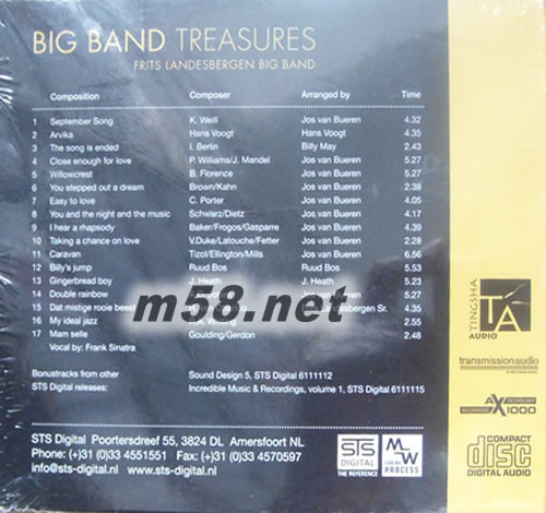 瑞典示范天碟BIG BAND 大樂隊(m58.net) 瑞典TA示范天碟 Frits Landesbergen Big Band - Big Band Treasures 蘭德斯柏根大樂隊 - 大樂隊的瑰寶 縱橫爵士大樂隊音樂領域40年,蘭德斯柏根大樂隊在荷蘭STS Digital發(fā)燒品牌下推出第二張專輯,首度與瑞典Transmission Audio (下稱TA)合作,TA最為人熟悉的是一套由12個獨立音箱組成之MkIII型號,價值約?200萬美元,當然是全人手製造,更被稱為終極超豪華巨無霸音響系統(tǒng);這套重約4噸,高7英尺,整體寬度約?37英尺的驚人旗艦作品,是音響發(fā)燒友終極之夢。STS Digital使用Nagra IV-S (?吋類比母帶)手提錄音機,混音監(jiān)聽以TA最新推出之M1i揚聲器配合Siltech名線,為蘭德斯柏根大樂隊製作出最發(fā)燒的聲音,big band大樂隊的音樂不再被誤解為難接受,在好的聲音下,音樂變成平易近人。