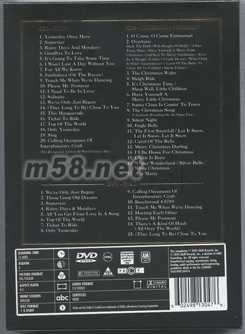 CD 1 1、YESTERDAY ONCE MORE 2、SUPERSTAR 3、RAINY DAYS AND MONDAYS 4、GOODBYE TO LOVE 5、IT‘S GOING TO TAKE SOME TIME 6、I WON’T LAST A DAY WITHOUT YOU 7、FOR ALL WE KNOW 8、JAMBALAYA 9、TOUCH ME WHEN WE DANCING 10、LEASE MR POST MEN 11、I NEED TO BE IN LOVE 12、SOLITAILE 13、WE‘RE ONLY JUST REGUN 14、CLOSE TO YOU 15、THIS MASQUEARDE 16、TICKET TO RIDE 17、TOP OF THE WORLD 19、SING 20、CALLING OCCUPANTS OF INTERPLANETARY CRAFT (THE RECOGNISED ANTHEM OF WORLD CONTACT DAY) CD 2 1. O Come, O Come, Emmanuel 2. Overture: Deck the Halls (With Boughs of Holly) /I Saw Three Ships/Have 3\THE CHRISTMAS TIME/SLEEP WELL,LITTLE CHILDREN 6\HAVE YOURSELF A MERRY LITTLE CHRISTMAS 7\SANTA CLAUS IS COMIN TO TOWN 8\THE CHRISMAS SONG 9\SILENT NIGHT 10\JINGLE BELLS 11\THE FIRST SNOWFALL/LET IT SNOW,LET IT SNOW ,LET IT SNOW 12\CAROL OF THE BELLS 13\MERRY CHRISMAS DARLING 14\I'LLBE HOME FOR CHRISMAS 15\CHRIST IS BORN 16\WINTER WONDERLAND/SILVER BELLS/WHITE CHRISTMAS 17\AVE MARIA