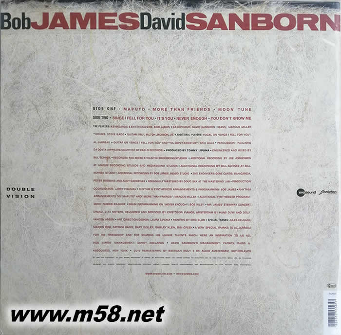 爵士鋼琴、薩克斯跨界大師的合作-- Double Vision 黑膠(m58.net) 鮑勃·詹姆斯( Bob James) 身為融合爵士、輕柔爵士翹楚的鍵盤、鋼琴手。曾兩獲格萊美大獎,發行過超過30張專輯,5 次登頂Billboard 爵士樂榜單,拿過各種名目的終身成就獎。他既是抒情爵士(Smooth Jazz)鍵盤演奏的代表人物,也是將融合爵士(fusionjazz)推向主流的先驅。 David Sanborn 6座葛萊美獎肯定的跨界爵士薩克斯風大師