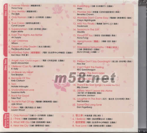 Disk 1 01 Forever Friend - Fiona Fung (“樓盤”廣告歌) 02 Stay Awhile - The Bells (“樓盤”廣告歌) 03 Only Human - K (“一公升眼淚”主題曲) 04 True Colors - Cyndi Lauper (護理用品廣告歌) 05 Superwoman - Karyn White (王菲“多得他”原曲) 06 Even The Nights Are Better - Air Supply 07 Last Christmas - Wham 08 Dream A Little Dream - The Beautiful South (“朱古力”廣告歌) 09 Close Your Eyes - Ken Hirai (輕閉雙眼) (電影“世界中心呼喚愛”主題曲) 10 Everything - Misia (“大和撫子”主題曲) 11 Promise Me - Beverley Craven (林憶蓮“沒有你還是愛你”原曲) 12 Promises Don’t Come Easy - Caron Nightingale (電視劇“無業樓民”插曲) 13 Miss You Finally - Trademark (電視劇“妙手仁心”插曲) 14 Seasons In The Sun - Westlife 15 Proud Of You - Fiona Fung (容祖兒“我的驕傲”原曲) 16 Gung - Howl (鸚鵡)(韓劇“宮”主題曲) 17 Shawasena Katsumatsu - Eichi Ohtaki (幸福之結末)(日劇“戀愛世紀”插曲) Disk 2 01 Angel - Sarah McLachlan (電影“天使多情”主題曲) 02 I Believe I Can Fly - R Kelly (“銀行”廣告歌) 03 Unbreak My Heart - Toni Braxton 04 Because Of You - Kelly Clarkson 05 Torn - Natalie Imbruglia 06 Unconditional Love - Susanna Hoff 07 Back For Good - Take That 08 You’re A Part Of Me - Julie Simon (“棟篤神探”插曲) 09 Fallen - Lauren Wood (“風月俏佳人”插曲) 10 Please Don’t Say Goodbye - Five Star (張立基“你好嗎”原曲) 11 Can’t Fight This Feeling - REO Speedwagon 12 Through The Barricades - Spandau Ballet 13 Hold Me Now - Johnny Logan (杜德偉(抱緊我)原曲) 14 THERE'LL BE SAD SONGS (TO MAKE YOU CRY BILLY OCEAN) 15 LONELY WON'T LEAVE ME ALONE-JERMAINE JACKSON (林子祥(千憶個夜晚)原曲) 16 LAUGHTER IN THE RAIN - NEIL SEDAKA(呂方、倫永亮(沙沙的雨)原曲) 17 SAME OLD LANG SYNE - DAN FOGEIBERG