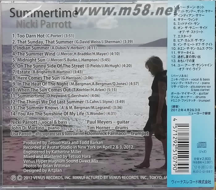 Summertime夏日時(shí)光(m58.net) 繼專(zhuān)輯《櫻花戲春》后,性感可愛(ài)的妮基.派洛特以《夏日時(shí)光》與樂(lè)迷一起迎接夏天! 序曲性感俏皮的「Too Darn Hot」,為夏天展開(kāi)火熱的序幕,「That Sunday, That Summer」如夏夜般沁涼悠閒,爵士經(jīng)典名曲「Summertime」在妮基.派洛特沙啞曼妙的嗓音詮釋下,為《夏日時(shí)光》增添了更多勾人心弦的柔情風(fēng)采。 Nicki Parrott - vocal & bass John Di Martino - Piano Lisa Parrott - Soprano And Bariton Saxophones Paul Meyers - Guitar Tim Horner - Drums Dominick Farinacci - Trumpet