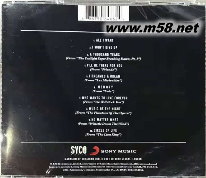 1 All I Want 2 I Won't Give Up 3 A Thousand Years 4 I'll Be There for You 5 I Dreamed a Dream 6 Memory 7 Who Wants to Live Forever 8 Music of the Night 9 No Matter What 10 Circle of Life