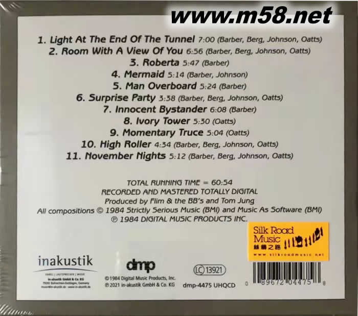 隧道Tunnel 爵士四重奏(貝斯、鼓、鋼琴、木管) UHQCD(m58.net) Jimmy Johnson (nicknamed "Flim"), 5-string bass 低音貝斯 Bill Berg (drum & percussion鼓與打擊樂) Billy Barber(piano, keyboard &synthesize鋼琴、鍵盤與合成) Dick Oatts (woodwind木管樂) 1. 由五弦低音結他手,綽號"弗連"的吉米‧約翰遜(Jimmy Johnson, nicknamed "Flim")的別名和鼓手比爾‧伯格(Bill Berg)及琴鍵手比利‧巴伯Billy Barber)姓氏的頭一個字母"B"所組成的「弗連與BB樂隊(Flim & The BB's)」與著名發燒品牌「DMP」(Digital Music Products, Inc.)於1983年錄製的第一張專輯《三輪車(Tricycle)》獲得空前成功,成為爵士樂迷和「發燒友」的鑑賞和鑑聽必備之選。隨后樂隊迅即製作第二張專輯《隧道(Tunnel)》,表現與成績與《三輪車》不遑多讓,更榮獲《「光碟評論音樂雜誌」- 1984年度爵士樂最佳鐳射光碟專輯」奬(「CD Review」- Jazz CD of the Year)》,成績蜚然。 2. 樂隊各成員擁有高超的演奏技術毋庸置疑,這次繼續與著名木管樂樂手迪克‧奧特斯(Dick Oatts)合作(奧特斯隨后亦成為樂隊的固定成員),他盡顯橫溢的音樂才華,分別以中音薩克斯管、長笛、電鋼琴、單簧管、高音薩克斯管、短笛及次中音薩克斯管合力吹奏專輯內每一首歌曲,他杰出吹奏技巧除了凸顯每一吹管樂器的特色外,更能與樂隊如魚得水,天衣無縫般地融合。 3. 專輯內的歌曲被視為融合爵士樂(fusion jazz)標誌性的作品,這樂種所應有的元素包括內藴的動力,有令人感覺游閒休悠,開懷愉悅的旋律,平和順滑的節奏和鬆弛愜意的氣氛在樂曲中可全面地體驗得到,加上採用當時最先進的數碼錄音器材和技術製作,無論是音樂性的表達,錄音效果的表現皆是上乘之作,備受各界擊節讚賞。 4. 專輯內的樂曲仍然充滿為人津津樂道和讃嘆不已的電子合成器配合上各種樂器的演奏,起伏有致,動態豐盈,音像飽滿清晰,音質厚實,線條分明,將美樂以驚人的真實度呈現。現將原裝母盤採用最新技術加以改良和調整,並以UHQCD為載體,塑造出更理想、更純凈的音色和音效。示范級的演奏,典藏級的錄音,盡展從容優雅的融合爵士樂的魅力。