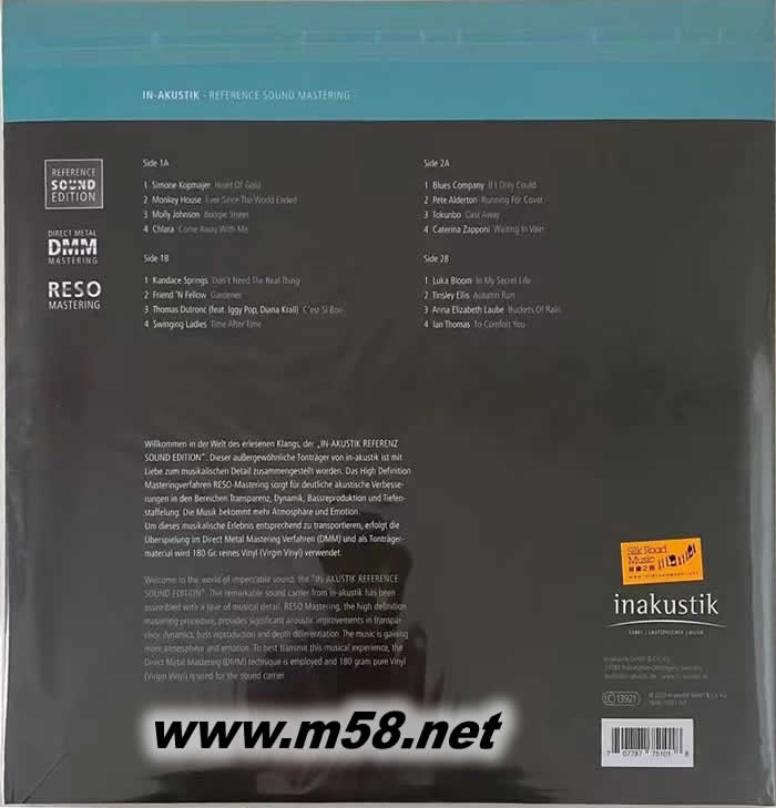 1. 「音準對比」系列 (Reference Sound Edition)是音響界極負盛名的德國「原音(inakustik)」公司數年前所締造的多個高質音效規格的鑑賞專輯,這系列的母盤是採用音準對比製作(RESO Mastering – Reference Sound Mastering),是現今最高解像度技術使原母盤內的音源效果得以改良和提升,清晰透明度更高,動態范圍更寬更廣,低頻更重更深,是音響發燒友夢寐以求的音效,亦受到他們極到讚許。 2. 秉承著這系列的製作方針、的特質和方向,「原音」公司繼續精心炮製最新專輯《優美動聽的情歌(Great Ballads)》,精挑多位享譽國際樂壇,唱功卓越,風格各異的男女歌手、組合和樂隊以清澈嘹亮,感性動人的聲線演繹十六首優美動聽,永恆不朽的情歌。這些歌曲旋律悅耳迷人,配合感性悠揚的歌聲,單從音樂欣賞方面已令人百聽不厭,加上超卓的音效,更加令人回味無窮。 3. 被挑選的歌曲來自多個不同國家的著名唱作人、民歌手、爵士樂和藍調樂歌手、組合和樂隊最具代表性的名曲包括奧地利爵士女伶席夢妮‧科普梅爾(Simone Kopmajer)的《Heart Of Gold(赤子之心)》;加拿大爵士樂隊「猴子屋(Monkey House)」的《Ever Since The World Ended(自從世界末日開始)》、爵士樂天后莫莉‧約翰遜(Molly Johnson) 的《Boogie Street)(布吉舞曲街)》和唱作人伊恩‧托馬斯(Ian Thomas)的《To Comfort You(安撫你)》;英國的菲律賓裔爵士新星卡拉拉(Chlara)的《Come Away With Me(與我共退)》與藍調天王彼德‧艾德頓(PetenAlderton)的《Running For Cover(尋找庇護)》;德國著名樂隊「藍調公司(Blues Company)」的 《If I Only Could(如果祇有我能)》和組合「非凡(Friend 'N Fellow)」的《Gardener(園丁)》及德國籍尼日利亞裔爵士天后陶筠寶(Tokunbo)的《Cast Away(摒棄)》;美國爵士女星卡特琳娜‧扎波尼(Caterina Zapponi) 的《Waiting In Vain(空等待)》和坎迪絲‧史冰斯(Kandace Springs)的《Don't Need The Real Thing)(不需要真實的東西)》、多才多藝女唱作人安娜‧伊麗莎白‧勞伯(Anna Elizabeth Laube)的《Buckets Of Rain(滿載雨水)》和藍調圣手廷斯利‧艾里斯(Tinsley Ellis)的《Autumn Run(秋之疾走)》;來自法國的爵士男神托馬斯‧杜特龍(Thomas Dutronc)攜手與天皇巨星伊基‧波普(Iggy Pop)及戴安娜‧克瑞兒(Diana Krall)共同演繹的《C'est Si Bon(真的太奇妙)》和耀眼的合唱組合「搖擺淑女(Swinging Ladies)」的《Time After Time(反覆地)》與及愛爾蘭民歌巨星盧卡‧布魯姆(Luka Bloom)的 《In My Secret Life(在我秘密的人生里)》等,首首都是精彩絕倫。 4. 一眾歌手與音樂人都各具特色,這專輯以以180克33轉處女雙黑膠唱片為載體,金屬直刻母盤(Direct Metal Master)及后期製作程序由「老虎魚」著名工程師漢斯-約爾格·莫斯克斯(Hans-Joerg Maucksch) 負責操刀,是高質音效的保証。每首樂曲皆能展現高解析度,立體空間感十足,音場開濶,人聲輕鬆自然,強勁或是微弱的細節清晰,樂器演奏音質厚實,線條分明,加上超卓的演繹,大師級的錄音和母盤製作技術,整體效果更為自然真實、層次更為分明,充滿映像式的質感,使你更能聆聽到每一樂曲的真與美,是鑑賞與鑑聽美樂必備之選。