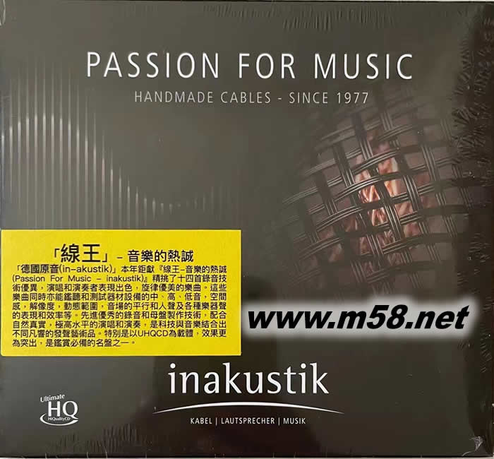 價格為估,以實到貨為準! 線王-音樂的熱誠 Passion For Music inakustik UHQCD(m58.net) 1. 從1977年開始,有線王之稱的德國“原音”公司(in-akustik)以制造高質素的專業音響接線馳名于世,同時其錄音制作亦以極高嚴格要求見稱,軟、硬體產品經常有緊密及互動性的活動和項目以配合市場宣傳推廣的目的,冀能得到相得益彰的效果。 2. 繼‘線王-聲效鑑試盤(in-akustik Soundcheck)’和‘音準對比測試鑑聽(Reference Sound Check)’兩張鑑試專輯獲得空前成功,口碑載道,“德國原音”再接再厲,精心炮制最新一輯鑑聽盤‘線王-音樂的熱誠(Passion For Music - inakustik)’以提供追求完美音質和音效的“發燒友”用作測試其音響設備特別是導線的表現,同時亦能欣賞令人回味無窮的美麗樂曲。 3. 專輯精挑了十四首錄音技術優異,演唱和演奏者表現出色,旋律優美的樂曲。這些樂曲同時亦能鑑聽和測試器材設備的中、高、低音,空間感,解像度,動態范圍,音場的平行和人聲及各種樂器聲的表現和效率等,但音樂欣賞價值極高。 4. 先進優秀的錄音技術,配合自然真實,極高水平的演唱和演奏,這鑑定盤是科技與藝術的優越之作。加上以45轉180克雙黑膠盤為載體,直刻金屬母盤(Direct Metal Mother)由發燒界另一巨擘“老虎魚”負責制作,展現前所未有的聲音美感,效果更趨完美。