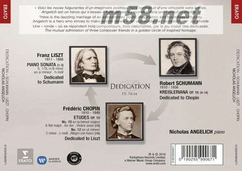 價格為估,以實到貨為準! DEDICATION(m58.net) 美國鋼琴家安杰利希把這張專輯獻給舒曼、李斯特與蕭邦這三位年齡相近的浪漫樂派偉大作曲家。專輯標題「迴旋舞」的源由,來自隱藏在這些曲目背后,三名音樂家間惺惺相惜的逸事:舒曼把《克萊斯勒魂》題獻給蕭邦,蕭邦則把作品10里的兩首練習曲題贈給李斯特。而李斯特著名的B小調奏鳴曲題獻給舒曼。 1832年二月,三人之中年齡最小的李斯特在巴黎普萊耶廳欣賞最年長的蕭邦獨奏會。二十歲的李斯特讚美將滿二十二歲的蕭邦,「在他的藝術中,為如何結合善感的詩情與巧妙的革新,開展了全新的局面」。而兩個月前,舒曼才在《大眾愛樂》雜誌發表文章讚美蕭邦的鋼琴曲莫札特歌劇《讓我們手牽手》主題變奏,以這句著名的話讚揚蕭邦:「諸君,請脫帽!一位天才!」1835年,蕭邦與舒曼在萊比錫第一次見面;五年后,舒曼前往萊比錫與李斯特見面,彼此交換作品總譜讓對方品評。 安杰利希的曲目以十九世紀下半葉為重心。他認為「舒曼明白如何根據自己的意愿,讓鋼琴聽起來很不一樣。因此,我覺得從人們認為鋼琴王子蕭邦的靈巧流暢特點,來批評舒曼作品『粗笨』是不公平的。而蕭邦非常了解自己樂器,就像是先前沒有人如他那么了解鋼琴一般。」