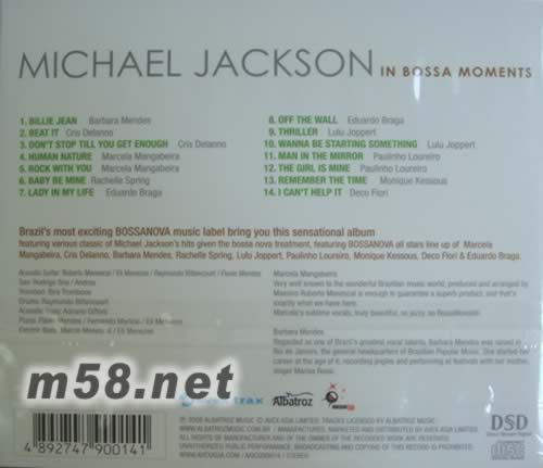 IN BOSSA MOMENTS(m58.net) 來自巴西的BOSSANOVA代表性品牌推出的[IN BOSSA MOMENTS]系列; 力邀榮獲巴西Grammy金牌女王Marcela Mangabeira,Cris Delanno,Barbara Mendes,Rachelle Spring,Lulu Joppert,Paulinho Loureiro,Monique Kessous,Deco Fiori等叱咤歌壇的歌手一同為本張專輯獻聲;替MICHAEL JACKSON多首歌曲作精彩BOSSANOVA演繹的精選系列。 擁抱BOSSANOVA 50周年紀念,一次過擁有最精彩,最親切的流行經典,原裝巴西發燒靚聲錄音,FULL(DSD)MASTERED制作。 MICHAEL JACKSON / BACK TO LOVE / CARPENTERS-IN BOSSA MOMENTS三CD系列,最完美感官全接觸!