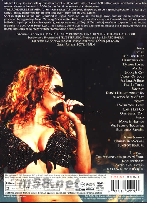 DISC1 1 It's like that 2 Heartbreaker 3 Dream lover 4 My all 5 Shake it of 6 Vision of love 7 Fly like a bird 8 I'll be there 9 Fantasy 10 Don't forget about us 11 Always be my baby 12 Honey 13 I wish you knew 14 Can't let go 15 One sweet day 16 Hero 17 Make it happen 18 We belong together Bonus Features 19 Butterfly reprise 20 Behind-the-scenes (Bonus feature) 21 Jukebox feature Bonus feature) DISC2 22 The adventures of Mimi tour 23 Documentary 24 Lovers and haters 25 Karaoke-style feature