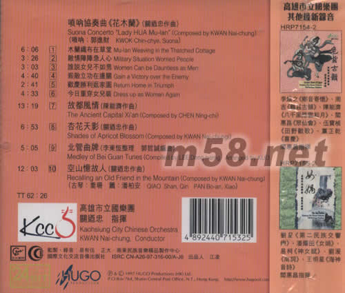 1.木蘭織布在草堂MU-LAN WEAVING IN THE THATCED COTTAGE 2.敵情陣陣急人心MILITARY SITUATION WORRIED PEOPLE 3.誰說女兒不如男WOMEN CAN DE DAUNTLESS AS MEN 4.殺敵立功在邊關CAIN A VICTORY OVER THE ENEMY 5.歡慶勝利返家園RETURN HOME IN TRIUMPH 6.今日重穿女兒裝DRESS UP AS WOMAN AGAIN 7.故都風情(陳能濟作曲) THE ANCIENT CAPITAL XI AN (COMPOSED BY CHEN NING -CHI) 8.杏花天影(關酒忠作曲) SHADES OF APRICOT BLOSSOM(COMPOSED BY KWAN NAI -CHUNGI) 9.北管曲牌(李東恒整理 郭哲誠編曲) MEDIEY OF BEI GUAN TUNES(COMPILED BY LEE DONG -HERNG ARRANGED BY KUOO CHE-CHEN) 10.空山憶故人(關遒忠作曲) RECALLING AN OLD FRIEND IN THE MOUNTAIN (COMPOSED BY KWAN NAI-CHUNG)