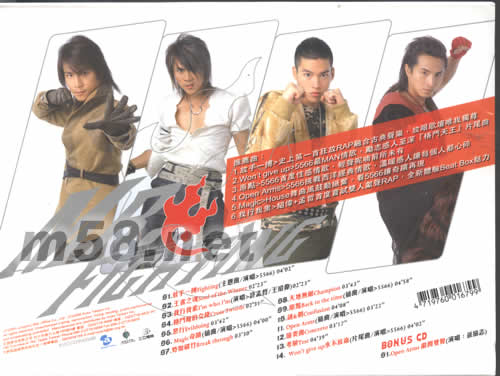 價格為估,以實到貨為準! 格斗天王電視原聲帶(臺灣開春限量版)(m58.net) 請點看產品正、背面大圖 年度銷量第一名亞洲天團5566開春最新巨作 CD1+1加贈 1、孫協志限量獨唱版“OPEN ARMS”珍藏CD 2、5566 2005格斗寫真年歷