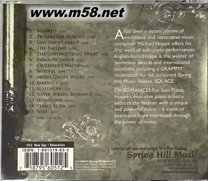 ROMANCES FOR SOLO PIANO 浪漫琴韻 新世紀純音樂(m58.net) 你曾為金哈克曼1984年的電影代表作「愛的世界Misunderstood」動容落淚;或震攝於克林伊斯威特「來自硫磺島的信」的人性描繪嗎?相信我,那些憾動心弦的段落要少了Michael Hoppe的配樂操刀,準像雕琢華美的臺詞少了演員適切語調的詮釋般失色。這位精通音樂語彙的鍵盤大師,不但將新世紀音樂這股方興未艾的潮流導向更遠彼端,更廣受電影配樂傳奇Vangelis、影視雙棲名伶Suzanne Doucet等人的推介認可。在交出數張商業/藝術兼備的傑出作品,如葛萊美獎提名「Solace」之後,Michael Hoppe決定以鋼琴家的身份出發,結果就是這張動人的獨奏專輯。 「Romances For Solo Piano」不僅收錄全新的創作曲目,也將部份已發表的作品重新編排演譯。取自「Solace」專輯的Farewell說明了Michael Hoppe通徹歌心的音樂視野。原曲以Harold Moses的中提琴為主軸,時而抑鬱時且悠揚的琴音與女高音Heidi Fielding相呼應。一方若步履蹣跚的出征兵員;一方是空待歸人的思婦,將送別的不捨及牽掛描繪滲骨。新版則將劇本以鋼琴重新譜寫,左手低聲部的合鳴推著右手私密旋律,詩意的留白讓聽者更有畫面想像。感傷情節被鍵裡湧出的暖意包圍,似也擁有堅強下去的力量:坦承面對人生起落,這麼誠實的信念點出專輯非凡的價值。 談到創作的出發點Michael Hoppe如是說“需要更多矯作的情節嗎?這世界給的早超出人們所需。我的音樂不是要影響他人,而是對本心的誠實交代。這想法若能傳遞給其它遊蕩的心,便完成我最深切的祈禱。聽著Children’s Waltz這首獻給下個太平盛世的圓舞曲,相信能把信念灌注作品中的音樂家,是你我都不應該錯過的。