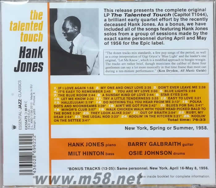 爵士鋼琴四重奏Talented Touch 天才之觸(爵士大師五星系列)(m58.net) HANK JONES 鋼琴 BARRY GALBRAITH 吉它 MILT HINTON 低音大提琴 OSIE JOHNSON 鼓 數字修復版包含完整的原創LP黑膠《天才之觸》,這是漢克瓊斯早期的四重奏。 以Barry Galbraith,Milt Hinton和Osie Johnson為特色。 作為獎勵,本專輯收錄了1956年4月和5月期間由Epic品牌制作的所有Hank Jones獨奏歌曲。