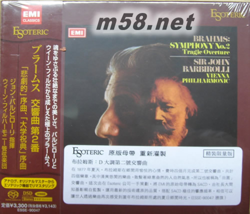 價格為估,以實到貨為準! 勃拉姆斯 D大調第二號交響曲 Brahms Symphony No.2 in D SACD (日本精裝限量版)(m58.net) 指揮:JOHN BARBIROLLI 在1877年夏天,布拉姆斯在鄉間用愉悅的心情,費時四個月完成第二號交響曲,共計四個樂章。其中清爽悠閑的樂曲,散發著綠意盎然的人自然氣氛,所以也被稱為田園交響曲。由在ESOTARIC公司一手策劃,將EMI的原始母帶轉為SACD,由神長大問知基彰親自監制,運用最新的技術還原的品質,搭配SACD極佳的響應頻率,相信可以讓世人透過樂曲再次感受到當年布拉姆斯所處的夏日鄉間時光。