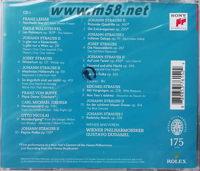New Year's Concert 2017年維也納新年音樂會 CD(m58.net) 全球焦點華麗盛事,第七十六屆維也納新年音樂會影音全記錄隆重上市。 創記錄!交付史上最年輕的年度指揮家─杜達美,首次統御維也納新年音樂會。 九位作曲家二十一首演出曲目完整收錄,包含初登場之作曲家雷哈爾等共八首嶄新樂曲。 堅持歐式傳統精神的維也納愛樂,與迸發拉丁活力的指揮巨星杜達美,攜手開啟維也納新年音樂會新紀元。