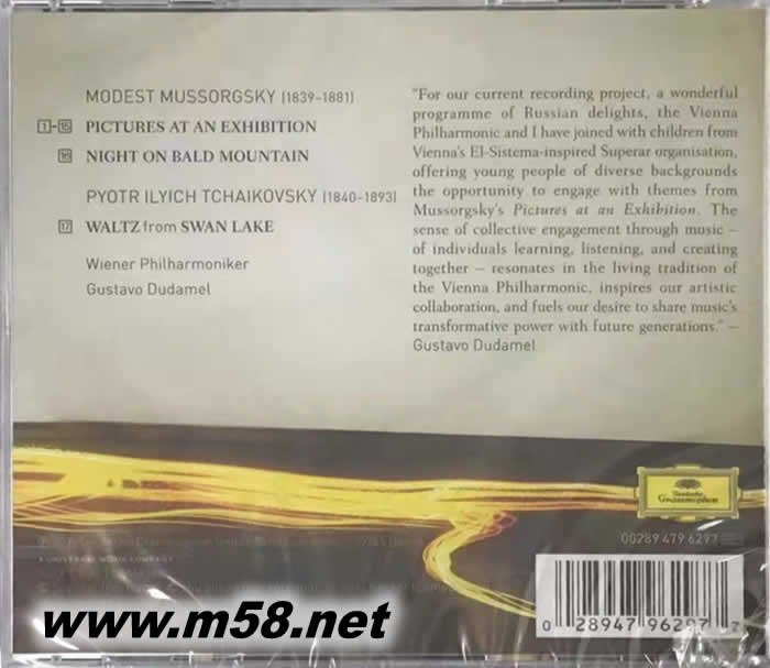 穆索爾斯基:圖畫展覽會 Mussorgsky: Pictures At An Exhibition(m58.net) 作為Deutsche Grammophon的獨家錄音藝術(shù)家慶祝十周年,Gustavo Dudamel的職業(yè)生涯已從委內(nèi)瑞拉Wunderkind演變?yōu)槭澜缟献罱艹龊妥钍軞g迎的Maestros之一。他即將錄制的唱片是2016年4月在維也納音樂博物館(Musikverein)與維也納愛樂樂團(tuán)(Wiener Philharmoniker)一起制作的,是全俄羅斯的專輯-結(jié)合了Mussorgsky的兩幅作品,Ravel宏偉的編排中的Pictures at a Exhibition,以及Bald Mountain的A Night on Bald,柴可夫斯基天鵝湖上著名的華爾茲舞。維也納華爾茲國王和達(dá)達(dá)梅爾(Dudamel)使這個常年的芭蕾舞劇著重于新鮮,生機勃勃的新讀物-完美地介紹了節(jié)日季節(jié)。展覽中的圖片是音樂中轉(zhuǎn)錄最完整,排列最整齊的作品之一,是音樂的試金石,啟發(fā)了許多藝術(shù)家