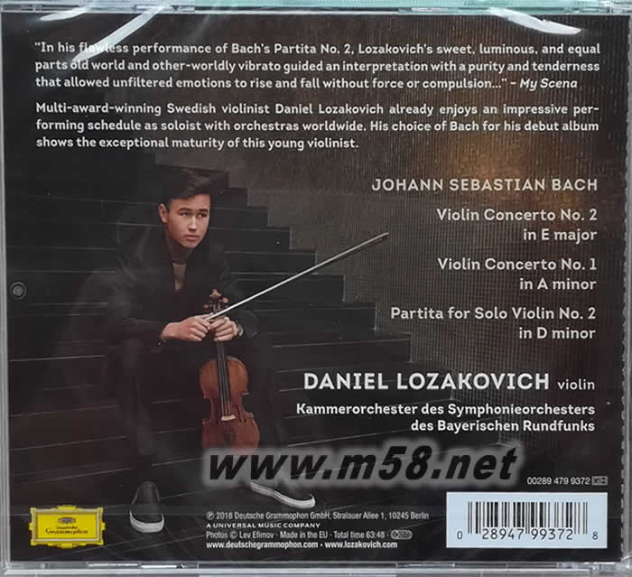 Bach: Violin Ctos # 1&2 瑞典年青天才小提琴手 丹尼爾 羅佐科維奇 首張專輯(m58.net) 年僅17歲瑞典年青小提琴手, “Daniel Lozakovich”繼Anne-Sophie Mutter及David Garrett成為DGG廠牌最年輕小提手。 榮獲多項獎座﹐如2016年Vladimir Spivakov國際小提琴比賽 ”冠軍”﹐實力備受肯定! 更獲多位名師﹐如Daniel Barenboim﹐Andris Nelsons﹐Daniel Hope支持! 樂迷值得關(guān)注﹐更不能錯過全新大碟! 2001年出生于斯德哥爾摩的丹尼爾·羅佐科維奇(Daniel Lozakovich)無疑是眾多小提琴家中一顆極其奪目而閃耀的新星。年僅17歲的他不僅自身實力非凡,而且已與眾多演奏大家、頂尖名團在國際舞臺上一展風(fēng)采。 2016年,15歲的丹尼爾與環(huán)球音樂旗下古典樂廠牌Deutsche Grammophon(簡稱DG)簽署了獨家唱片合約,自此成為了大黃標(biāo)旗下最年輕的小提琴家。國外媒體對于丹尼爾有著這樣的評價:“當(dāng)別的’神童’還在努力成為專業(yè)樂手時,羅佐科維奇已經(jīng)是一名’職業(yè)演奏家’了?!?br>在DG總裁克萊門斯·特勞德曼的眼中,丹尼爾身上則同時具備了“天賦異稟、完美實力,以及為古典音樂執(zhí)著奉獻的精神”,他形容,在丹尼爾身上“我們能看到璀璨的未來”。 3月28日下午,在瑞士大使館舉辦的韋爾比耶音樂節(jié)發(fā)布會上,音樂財經(jīng)也和這位頗有潛質(zhì)的年輕小提琴家聊了聊他的經(jīng)歷和演出生涯。采訪當(dāng)天,他穿著白色襯衣,黑色休閑褲和一雙白色運動鞋,相比于臺上的沉著、專注,臺下的丹尼爾則更多的給人一種少年天生就有的稚嫩而青春的感覺。