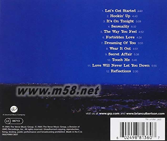 Brian Culbertson的名字已經在爵士樂界活躍了十年多, 很早以前, 他已經出版第一張個人大碟, "Long Night Out", 是由他親自監制的; 他不單止懂得玩多種的樂器, 更懂作曲, 他的才華令到他當年年紀輕輕已得到爵士樂權威雜志Down Beat的贊賞, 名氣漸增!! 多年來, 在WEA旗下推出了數張受歡迎的唱片, 和不少出色的樂手合作, 例如有David Sanborn, Marcus Miller, Herb Alpert等合作, 之后在今年(2005)正式加盟GRP Records并推出首張大碟, 充滿感性的精彩錄音!!