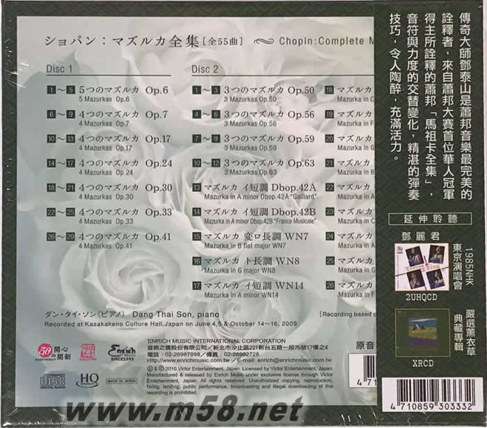 蕭邦:馬祖卡55曲全集 2HQCD(m58.net) HQCD是日本Memory-Tech公司所開發的高質感CD。CD基版的材料採用超薄型液晶面版等級的聚碳酸脂是其特徵之一。聚碳酸脂比過去的樹脂流動性、轉寫性及透光性更好,讓生產原盤的復製工作變得更加精密。因為高透明性、低雙折射性兼備所以讀取雷射的入射光使得結晶體安定、抑制散光因此比一般的CD更能正確的讀取訊號資料。這個材質的不同之處是聲音的顆粒細膩、解析度、透明感、臨場感等都極大提升且充份發揮聲音的效果。 大大提升品質與更精確讀取數據 比普通CD更近乎原音的高品質音色傳奇大師鄧泰山是蕭邦音樂最完美的詮釋者,來自蕭邦大賽首位華人冠軍得主所詮釋的蕭邦「馬祖卡全集」,音符與力度的交替變化,精湛的彈奏技巧,令人陶醉,充滿活力。 左撇子的鄧泰山5歲跟媽媽學琴,7歲的他為了躲避越戰,和媽媽在內的河內音樂學院全校幾百名師生與幾十件的樂器,全部遷至深山里。鄧泰山從小有一副好耳力,那時每位學生每天只能分配到20分鐘的練習時間,讓他更珍惜每次的練琴機會,也培養了他對音樂的專注力。 1970年,鄧泰山的母親受邀參觀波蘭華沙的蕭邦鋼琴大賽,回程她帶了很多蕭邦的樂譜和唱片。12歲的鄧泰山第一次聽到阿根廷女鋼琴家阿格麗希演奏蕭邦第一號鋼琴協奏曲時,從此迷上了蕭邦。 16歲的鄧泰山帶著僅有的50元美金進入莫斯科音樂學院,師事納坦森與巴許基洛夫。考官給他的評語是:「手指尚待訓練,但很有音樂性」。頭一年納坦森讚許他進步神速,而他認為那是因為在那之前他從未彈過一部 「正常」的鋼琴。 3年后,他被學校推舉出去參加蕭邦鋼琴大賽,鄧泰山與奪冠呼聲最高的波哥雷利奇,是莫斯科音樂學院的同班同學,后來波哥雷利奇未能進入決賽,戴著厚厚的眼鏡、窮到差點連上臺禮服都沒有的鄧泰山,一路過關斬將成為第十屆蕭邦鋼琴大賽的冠軍,這是該賽創辦53年來第一次由亞洲人獲得這個獎項,同時他還摘下了協奏曲、波蘭舞曲和象徵蕭邦靈魂的馬祖卡獎,當時他22歲。這張蕭邦的【馬祖卡55曲全集】,是鄧泰山在日本JVC的專業音樂大廠全新錄製發行的新專輯,來自蕭邦大賽首位華人冠軍得主,所詮釋的蕭邦-馬祖卡全集,讓人更加理解蕭邦語言的真正情懷。 大大提升品質與更精確讀取數據 比普通CD更近乎原音的高品質音色 多次世界巡迴演出,來自蕭邦大賽首位華人冠軍得主所詮釋的柴可夫斯基鋼琴套曲[四季],演奏音色優美,讓人屏息凝神,值得一再欣賞再欣賞。 左撇子的鄧泰山5歲跟媽媽學琴,7歲的他為了躲避越戰,和媽媽在內的河內音樂學院全校幾百名師生與幾十件的樂器,全部遷至深山里。鄧泰山從小有一副好耳力,那時每位學生每天只能分配到20分鐘的練習時間,讓他更珍惜每次的練琴機會,也培養了他對音樂的專注力。 1970年,鄧泰山的母親受邀參觀波蘭華沙的蕭邦鋼琴大賽,回程她帶了很多蕭邦的樂譜和唱片。12歲的鄧泰山第一次聽到阿根廷女鋼琴家阿格麗希演奏蕭邦第一號鋼琴協奏曲時,從此迷上了蕭邦。 16歲的鄧泰山帶著僅有的50元美金進入莫斯科音樂學院,師事納坦森與巴許基洛夫。考官給他的評語是:「手指尚待訓練,但很有音樂性」。頭一年納坦森讚許他進步神速,而他認為那是因為在那之前他從未彈過一部「正常」的鋼琴。 3年后,他被學校推舉出去參加蕭邦鋼琴大賽,鄧泰山與奪冠呼聲最高的波哥雷利奇,是莫斯科音樂學院的同班同學,后來波哥雷利奇未能進入決賽,戴著厚厚的眼鏡、窮到差點連上臺禮服都沒有的鄧泰山,一路過關斬將成為第十屆蕭邦鋼琴大賽的冠軍,這是該賽創辦53年來第一次由亞洲人獲得這個獎項,同時他還摘下了協奏曲、波蘭舞曲和象徵蕭邦靈魂的馬祖卡獎,當時他22歲。 柴可夫斯基鋼琴套曲《四季》,副題為“性格描繪十二幅"。全曲由十二首附有標題的獨立小曲組成。這些詩篇又與十二個月的季節特點相關聯,故樂曲以 “四季" 為名。