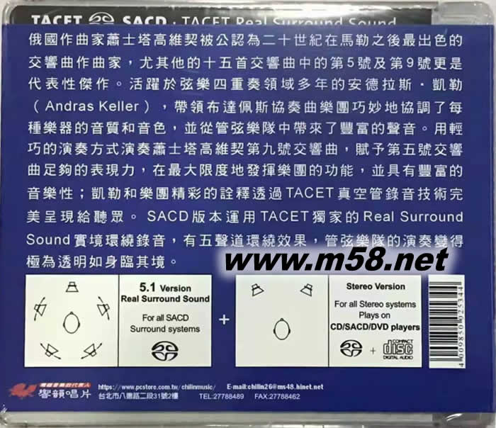 蕭士塔高維契 第五 九號交響曲 Dmitri Shostakovich : Symphony No.9 Op.70 ; Symphony No.5 Op.47 SACD(m58.net) 安德拉斯凱勒以小提琴家和凱勒四重奏的創(chuàng)始人而聞名,並擔(dān)任布達(dá)佩斯協(xié)奏曲樂團(tuán)的導(dǎo)演和指揮。布達(dá)佩斯協(xié)奏曲樂團(tuán)(Concerto Budapest)是匈牙利歷史最悠久的樂團(tuán)之一,擁有100多年的歷史,2007年,在其成立100週年之際,安德拉斯凱勒,世界著名的匈牙利小提琴家,被任命為樂團(tuán)的藝術(shù)總監(jiān)和首席指揮,在他的領(lǐng)導(dǎo)下,布達(dá)佩斯協(xié)奏曲成為最受尊敬的匈牙利巡迴樂團(tuán)。布魯克納第九號交響曲,指揮大師福特萬格勒稱其為「圣曲」,之所以廣受注目的原因之一:它是布魯克納的最后遺作,其二則是樂曲極為吸引人,聽眾總被其宏偉與神秘性所折服,可惜布魯克納卻來不及完成最終樂章。 本專輯為TACET第一張布魯克納作品的錄音,也代表了指揮安德拉斯凱勒,布達(dá)佩斯協(xié)奏曲樂團(tuán)和TACET新合作關(guān)係的開始,凱勒和樂團(tuán)精彩的詮釋透過TACET高品質(zhì)錄音技術(shù)完美呈現(xiàn)給聽眾。