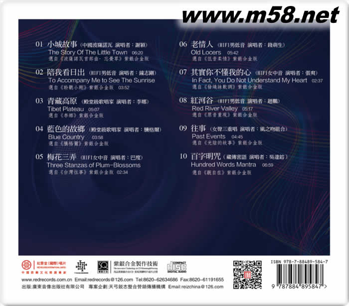 01 小城故事 (中國波薩諾瓦 演唱者:謝穎) The Story Of The Little Town 06:20 選自《波薩諾瓦首部曲·忘憂草》紫銀合金版 02 陪我看日出 (HIFI男低音 演唱者:鐘志剛) To Accompany Me to See The Sunrise 選自《聆聽小剛》紫銀合金版 03:52 03 青藏高原 (殿堂級歌唱家 演唱者:李娜) Tibet Plateau 05:07 選自《李娜》紫銀合金版 04 藍(lán)色的故鄉(xiāng) (殿堂級歌唱家 演唱者:騰格爾) Blue Country 03:58 選自《騰格爾》紫銀合金版 05 梅花三弄 (HIFI女中音 演唱者:巴度) Three Stanzas of Plum-Blossoms 選自《臺灣往事》紫銀合金版 02:34 06 老情人 (HIFI男低音 演唱者:錢萌生) Old Locers 05:42 選自《低音柔情》紫銀合金版 07 其實(shí)你不懂我的心 (HIFI女中音 演唱者:張爽) In Fact, You Do Not Understand My Heart 02:37 選自《發(fā)燒詠嘆調(diào)》紫銀合金版 08 紅河谷 (HIFI男低音 演唱者:趙鵬) Red River Valley 05:17 選自《原音重現(xiàn)》紫銀合金版 09 往事 (女聲三重唱 演唱者:風(fēng)之吻組合) Past Events 04:45 選自《光陰的故事》紫銀合金版 10 百字明咒(藏傳密語 演唱者:吳達(dá)鎔) Hundred Words Mantra 06:59 選自《觀自在》紫銀合金版