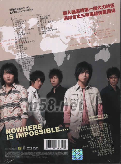 Disc 1 01. intro 紅 02. 孫悟空+放手 03. 終結孤單 04. OK啦 05. 叫我第一名 06. Talking of mayday 07. 燕尾蝶 08. 愛情萬歲+脫掉 09. 輕功 10. 恒星的恒心 11. 前進上海 12. 花(音樂來自四方) 13. 賭神 14. 戀愛ing 15. 前進北京 16. 知足 17. 牙關 18. HoSee 19. Tears For Fears 20. The Heart Beat Of 反擊 21. 晚安 地球人 22. 這個世界 23. 擁抱+相信 24. 小護士 25. 人生海海 Disc 2 26. 后臺段被刪 27. 約翰藍儂 28. 聽不到 29. 垃圾車 朋友版 30. 憨人 31. 軋車 32. 志明與春嬌 33. 溫柔[還你自由版] 34. 倔強 [當我們唱到回不了家]世界巡回演唱會幕后紀錄片 01. 臺南[真猛]歌迷篇+圣誕夜驚魂 02. 臺北[真拼]彩排篇+武裝+一棵蘋果 03. 日本[真駭]后臺篇 04. 美國[真遠]長征篇 05. 臺中[真愛]練團篇+愛情的模樣 06. 上海[真情]技師篇+亂世浮生 07. 北京[真憨]求婚篇 08. 成都[真逗]Kuso篇+闖 09. 吉隆坡[真慘]挫屎篇 10. 新加坡[真爽]同樂篇+第一天 11. 香港[真爭氣]光榮篇 12. 冠佑超人VCR 13. 怪獸+石頭熱身操VCR 14. 瑪莎小護士VCR 15. 超珍貴秘密片段
