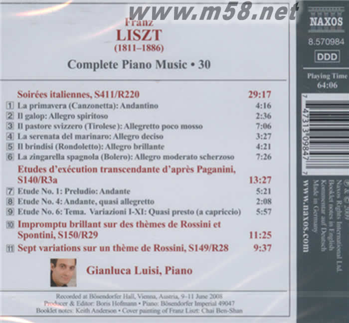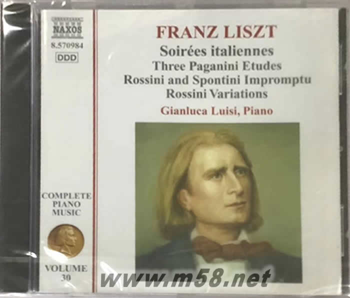 李斯特:鋼琴曲全集 Liszt:Complete Piano Music Vol. 30(m58.net) 拿索斯唱片公司的這個(gè)《李斯特:鋼琴曲全集-30》錄音,收錄了作曲家李斯特的一些相當(dāng)冷門獨(dú)奏鋼琴曲目,由鋼琴家吉安路卡?路易西演出灌錄,無論演繹還是錄音都可圈可點(diǎn)。 李斯特創(chuàng)作活動(dòng)的進(jìn)步的民主主義的傾向在很大程度上是與匈牙利的民族解放運(yùn)動(dòng)相聯(lián)系的。鋼琴曲《匈牙利狂想曲》是和李斯特的名字分不開的,正如圓舞曲和施特勞斯、交響曲與貝多芬的名字分不開一樣。李斯特的作品多姿多彩、極富想象力,充分挖掘了鋼琴的音響功能,對(duì)演奏者的技巧提出了很高的要求。作為那個(gè)時(shí)代最杰出的鋼琴家,他對(duì)鍵盤音樂的發(fā)展作出了重大的貢獻(xiàn),在他的后期作品中最早使用了20世紀(jì)才普遍采用的和聲語言。它的鋼琴曲已列入世界古典鋼琴曲的文獻(xiàn)寶庫。 李斯特所創(chuàng)作的鋼琴曲不但充分發(fā)揮了鋼琴的音樂表現(xiàn)力,而且這些作品是以匈牙利和匈牙利吉普賽人的民歌和民間舞曲為基礎(chǔ),進(jìn)行藝術(shù)加工和發(fā)展而成的,因而都具有鮮明的民族色彩。這些樂曲結(jié)構(gòu)精煉、樂思豐富活躍,音樂語言與音樂表現(xiàn)方法同匈牙利鄉(xiāng)村舞蹈音樂和城市說唱音樂有密切聯(lián)系,樂曲的形式雖然不時(shí)的變化,可是音樂形象始終鮮明而質(zhì)樸,體現(xiàn)了自然美和藝術(shù)美的完美統(tǒng)一。 他是最早把匈牙利民族音提高到世界水平的民族音樂家,他有愛國思想和民主思想,有積極要求變革生活的熱情,也有懷疑和失望的消極情緒,但占主要地位的常常是前者而不是后者。李斯特是肖邦的同代人,但他離開祖國的時(shí)間比肖邦更早,因此,他的思想和創(chuàng)作不能簡單地納入“民族樂派”。然而,作為一個(gè)匈牙利人,李斯特對(duì)祖國的事業(yè)真誠關(guān)注;民族的歷史和英雄人物,民間音樂的音調(diào)和節(jié)奏,在他的創(chuàng)作中都得到生動(dòng)的反映和運(yùn)用;加之他對(duì)東、北歐及俄羅斯青年作曲家的大力提攜和鼓勵(lì),使他在歐洲民族樂派的發(fā)展上起了積極的推動(dòng)作用。在他的祖國,人民始終尊崇他為偉大的“民族藝術(shù)家”。拿索斯這款錄音的主要內(nèi)容是他的《帕格尼尼主題練習(xí)曲》、《羅西尼主題即興曲》等獨(dú)奏鋼琴作品。 拿索斯目前全球最暢銷的三大古典名牌之一,其優(yōu)質(zhì)之錄音及演繹備受國際權(quán)威樂評(píng)人及音響界鼎力推崇,它的宗旨是盡量避免重復(fù)錄制同一曲目,故曲目廣泛,從西洋古樂至現(xiàn)代作品,曲目應(yīng)有盡有,儼然成為世界上最全備的古典音樂CD的百科全書。拿索斯不獨(dú)在銷售上贏得偌大的成功,同時(shí)亦贏得了權(quán)威樂評(píng)界的擁戴,各國權(quán)威音樂雜志如《留聲機(jī)》、《CD評(píng)論》、《美國CD指南》、及著名的《企鵝古典唱片指南》等,經(jīng)常給予高度推薦,就以2009年版《企鵝古典唱片指南》為例,有近1300款的拿索斯錄音被評(píng)為三星及三星以上榮譽(yù)。