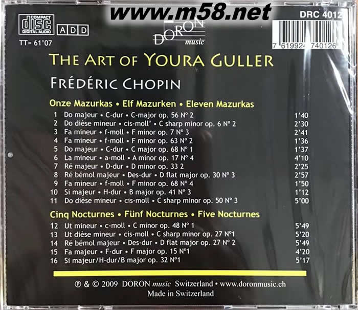 尤拉菊勒的鋼琴藝術(1) Chopin: Piano Works(m58.net) 2017唱片圣經總編私房銘盤 /no.54 ( CD版本) 柯爾托(Alfred Cortot)高足, 羅馬尼亞傳奇鋼琴女杰尤拉菊勒(Youra Guller)珍稀錄音 曲目: 蕭邦: 5首夜曲 / 11首馬祖卡舞曲 音色內斂雅致, 令聞者一聽難忘 瑞士原裝進口; 原廠母帶精心轉製