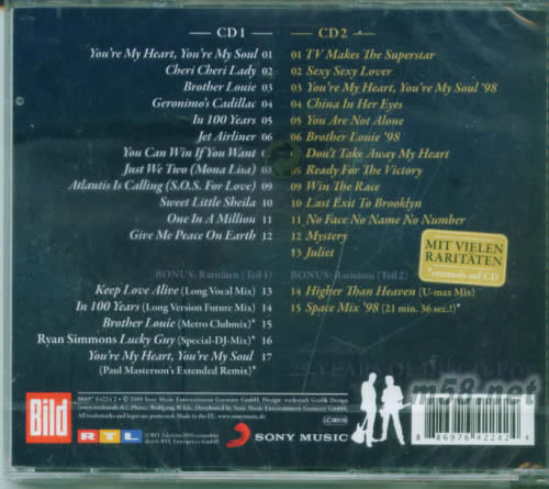 DISK 1 CD 1. You`re My Heart, You`re My Soul 2. Cheri Cheri Lady 3. Brother Louie 4. Geronimo`s Cadillac 5. In 100 Years 6. Jet Airliner 7. You Can Win If You Want 8. Just We Two (Mona Lisa) 9. Atlantis Is Calling (S.O.S. For Love) 10. Sweet Little Sheila 11. One In A Million 12. Give Me Peace On Earth 13. Keep Love Alive 14. In 100 Years 15. Brother Louie Metro Club Mix 16. Lucky Guy Special-DJ-Mix 17. Your`e My Heart, Your`e My Soul Paul Masterson`s Exte... DISK 2 CD 1. TV Makes The Superstar 2. Sexy Sexy Lover 3. You`re My Heart, You`re My Soul New Version 4. China In Her Eyes Vocal Version 5. You Are Not Alone 6. Brother Louie New Version 7. Don`t Take Away My Heart New Vocal Version 8. Ready For The Victory Radio Version 9. Win The Race 10. Last Exit To Brooklyn 11. No Face No Name No Number 12. Mystery 13. Juliet 14. Higher Than Heaven U-Max Mix 15. Space Mix `98