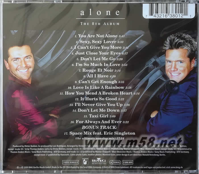 Alone - The 8th Album(m58.net) Modern Talking 是一支德國流行音樂雙人組合,由Thomas Anders和Dieter Bohlen組成。 直到目前為止,Modern Talking在商業(yè)上最成功的德國流行組合。他們的曲調(diào)給人印象深刻,演唱的歌詞則采用英語。 說起80年代的歐式舞曲旋風(fēng),當(dāng)中最具代表性的就非Modern Talking(摩登淘金合唱團(tuán))莫屬了?!禕rother Louie》(路易兄弟)是摩登淘金最經(jīng)典的一首歌(也就是港樂《連鎖反應(yīng)》的原曲)。 音樂類型:Euro Disco,Eurodance,Synthpop,Hi-NRG,Italodisco