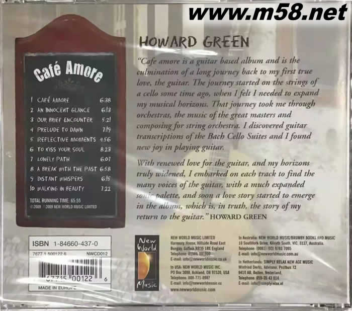 CAFE AMORE 鄉(xiāng)村(m58.net) CD 鄉(xiāng)村CAFE AMORE 霍華德·格林以其驚人的原創(chuàng)作品而備受贊譽(yù),他巧妙地將天使般的女聲與古典吉他、大提琴、鍵盤(pán)和輕柔的打擊樂(lè)器相結(jié)合,創(chuàng)造出一張優(yōu)美的音景專輯,讓人放松和振奮。想象一下,一大片清爽的晨露或沐浴在幾縷陽(yáng)光中的山間湖泊。有時(shí)作為背景,有時(shí)作為中心主題,迷人的旋律和節(jié)奏向我們?cè)V說(shuō)著性感、深沉的情感和歡樂(lè)的活力,同時(shí)永遠(yuǎn)捕捉著浪漫魅力的真正本質(zhì)。