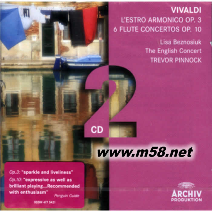 維瓦爾第:和諧的靈感Vivaldi:L'estro armonico 雙CD(m58.net) 由特雷沃•平諾克指揮英國音樂會樂團演奏的《維瓦爾第:和諧的靈感》,2009年的《企鵝古典唱片指南》中推薦為三星。 維瓦爾第在作曲方面所涉獵的音樂形式繁多,但人們公認他為巴洛克協(xié)奏曲領域的王者之一,維瓦爾第諸多創(chuàng)作中流傳至今的重要作品也以這類協(xié)奏曲居多。據(jù)統(tǒng)計,他一生總共寫作了400多首協(xié)奏曲,其中包括獨奏協(xié)奏曲和管弦樂協(xié)奏曲(兩者的區(qū)別在于前者為突出獨立的樂器而作,后者則是專為管弦樂團或合奏團譜寫的)。這些作品充分體現(xiàn)出維瓦爾第的音樂天賦,從中我們可以聽到鮮活的旋律、熱情的節(jié)奏、華麗的音色以及令人感到意外的音樂主題和對比變化,可以說這些協(xié)奏曲充分體現(xiàn)出了巴洛克音樂的特色。另外他還將巴洛克協(xié)奏曲三個樂章的組成定型為“快-慢-快”的變化方式,成為了同類作品中的典范(當然也有例外,維瓦爾第自己的創(chuàng)作中就有兩樂章或四樂章的協(xié)奏曲)。在其眾多作品里,有三組協(xié)奏曲(每組十二首)最為人們所熟悉——《和諧的靈感 Op.3》、《異乎尋常 Op.4》以及《和聲與創(chuàng)意的實驗 Op.8》。 英國本土古樂指揮大師特雷沃•平諾克(Trevor Pinnock)與他親手創(chuàng)立的英國音樂會樂團所演繹的巴洛克作品在專業(yè)評論界是擁有極高評價的。平諾克對古樂深厚的研究以及英國音樂會樂團清澈、明快的音色,在唱片中顯露無遺。 平諾克與英國音樂會樂團的合作,被認為是二十世紀后半最佳的古樂器(Period Instruments)演奏組合。平諾克極為敏銳的洞察力,以及深入的研究考證,使得整個演奏極具說服力。這款錄音以數(shù)碼方式錄制,音響效果更是杰出,是聆賞維瓦爾第這部《和諧的靈感》不可或缺的版本。