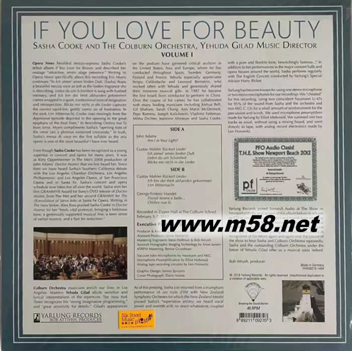 若你因美麗而愛 第1輯 If You Love For Beauty Vol.1 45轉(zhuǎn) 黑膠(m58.net) 莎夏.庫克《若你因美麗而愛》LP兩度格萊美大獎,被譽為現(xiàn)今最杰出和前途無限的女中音歌唱家莎夏.庫克以明艷亮澤的音色,清脆豐厚的聲線,情深細(xì)致地唱出亞當(dāng)斯、亨德爾及馬勒等人作品。45轉(zhuǎn)黑膠聲樂演唱示范盤之一。 1. 曾兩度獲得格萊美大獎(Grammy Award),被譽為現(xiàn)今最杰出和前途無限的女中音歌唱家莎夏.庫克(Sasha Cooke)以明艷亮澤的音色,清脆豐厚的聲線,演唱曲目非常廣泛,感情滿溢的歌唱嬴得不少樂迷的傾注,她這些令人欽羨的天份在她的最新專輯《若你因美麗而愛(If You Love For Beauty)》表露無遺。 2. 由大師級單簧管演奏家耶胡達(dá).吉拉德(Yehuda Gilad)於2003年在位於美國洛杉磯著名柯爾本音樂學(xué)院(Colnurn Conservatory of Music)創(chuàng)立的「柯爾本管弦樂團(tuán)」被當(dāng)代著名指揮家杰拉德‧施瓦茨(Gerard Schwarz)推許為”毫無疑問是世界上最好的樂團(tuán)之一”,雖然絕大部份成員是該校學(xué)生,但他們都是天資聰穎,具有成為明日之星的潛能,加上吉拉德與團(tuán)員心領(lǐng)神會的默契,欣賞他們的演奏誠然是賞心樂事。