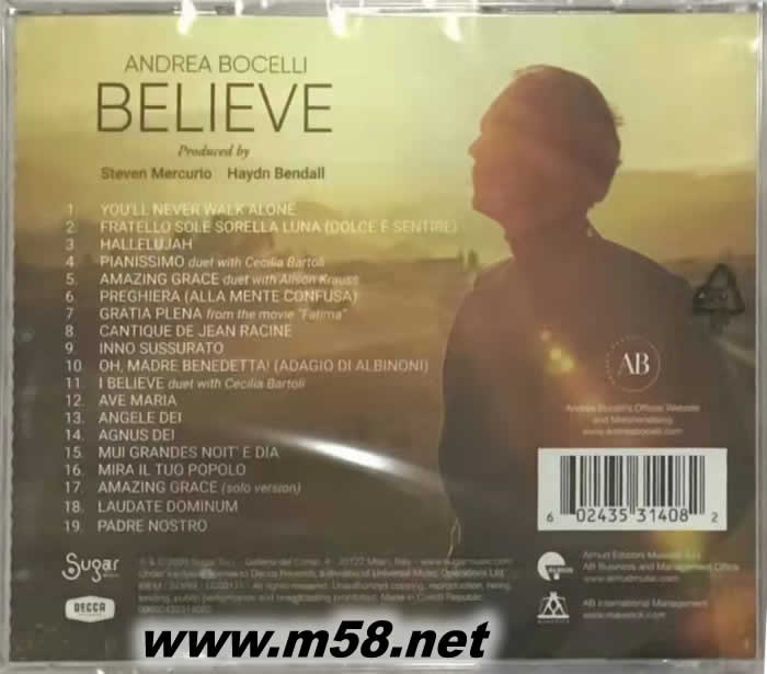 Believe 相信愛 (19首歌)(m58.net) 僅管前方充滿風雨 請繼續(xù)相信愛 ★媲美上帝美聲 史上第一跨界男高音,全新大碟降臨 ★感動豪華版精選葛萊美獎女藝人Alison Krauss感動合作”AMAZING GRACE”、經(jīng)典再現(xiàn)”AVE MARIA” 、”PIANISSIMO”…等17首撫慰人心之極致美聲 他的嗓音被譽為上帝賜予人類的最美的恩典,他的歌聲觸動著全球數(shù)億樂迷的內(nèi)心,有著史上第一跨界男高音美譽的Andrea Bocelli,我們何其有幸能在這個時代之下聆聽宛如上帝親傳的天籟,2020年4月12日,Andrea Bocelli在全球疫情擴散期間破天荒選在空無一人的米蘭大教堂前,同步LIVE連線全球億萬聽眾演出「波伽利:希望之歌演唱會」,這一天他的歌聲讓全球樂迷動容落淚,同時也讓這次表演成為YouTube史上「最多人收看的古典現(xiàn)場直播演出」,如今更難能可貴的是,Andrea Bocelli在如此混亂的2020年宣佈推出全新專輯【Believe】。 Andrea Bocelli自1982年踏入樂壇至今,憑藉著天賦與努力,終於在歌唱中展現(xiàn)了遠超眾人的能耐,並且因此踏上了國際巨星的階梯、一路扶搖直上,最終達到了前所未有的高度,成為史上第一跨界男高音,全球累積超過9,000萬張專輯的銷售,並且被義大利以及多明尼加授予了國家勛章、受邀在梵蒂岡在天主教教宗前獻唱、甚至在冬季奧運閉幕典禮、美國總統(tǒng)歐巴馬的圣誕音樂會、上海世界博覽會開幕典禮、國際足總世界盃決賽,甚至英國皇家婚禮上,都能聽見他完美的嗓音。然而2020這個堪稱人類數(shù)百年來最黑暗的一年,新冠肺炎不分國界侵襲全球,讓許多人活在絕望低潮之中,Andrea Bocelli決心要在這個時刻透過音樂與自己的歌喉,帶給人們希望和鼓舞的力量,「”相信(Believe)”這個詞背后帶表了三個意義:信仰、希望和善行,這是必備的三種美德,但是當跳脫出宗教,我認為信仰、希望和善行帶給所有人活著的意義,並且讓人們因此而完整」,帶著這樣的心境和意念,Andrea Bocelli在最艱困的時代之下,為所有人帶來這張【Believe】。 【Believe】由古典雙大師Steven Mercurio與Haydn Bendall(莎拉布萊曼、美聲男伶)聯(lián)袂操刀打造專輯,為Andrea Bocelli薰陶出最雋永完美的新世代作品;開場的歌曲”You’ll Never Walk Alone”,以音樂溫暖人心作為重點,透過感動人心的嗓音,體會到旋律的溫度和美妙;萬世不朽的名曲“Amazing Grace”,由葛萊美獎最多獲獎女藝人Alison Krauss 入陣獻唱,精彩合作形成令人動容的美妙天籟,塑造出跨越顛峰的極境之聲;除此之外,與知名次女高音Cecilia Bartoli共同演唱的經(jīng)典歌劇曲目”Pianissimo”、 傳奇作曲家Ennio Morricone為電影【法蒂瑪?shù)钠孥敗克V之名曲"Gratia Plena"等,都可以聽見這位史上第一跨界男高音用無與倫比的歌聲且精致洗鏈的技巧,讓人們徜徉在樂海的時刻忘卻現(xiàn)實中的煩惱和痛苦。【Believe】是當今所有人都該追隨的一張信仰之作,更是這個時代之下最激勵人心的完美作品。