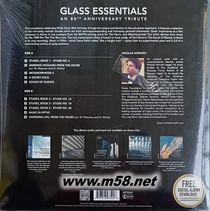 這張專輯是慶祝二十世紀最勇于突破,也最有影響力的美國作曲家菲利普格拉斯的80歲生日而制作的鋼琴獨奏專輯。包括:練習曲、清晨時光、變形記、簡約世界等經典作品,錄制格拉斯全系列專輯尼古拉斯霍瓦特對格拉斯的詮釋不容置疑。180克黑膠。