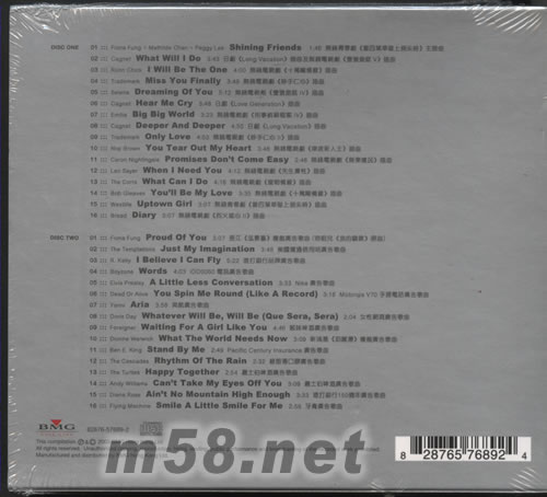 DISC 1 01. Shining Friends(無線青春劇“當四葉草碰上劍尖時”主題曲) 02. Promises Don t Come Easy(無線電視劇“無業(yè)樓民”插曲) 03. What Will I Do(日劇“Long Vacation”主題曲) 04. I Will Be The One(無線電視劇“十萬噸情緣”插曲) 05. Uptown Girl(無線青春電視劇“當四葉草碰上劍尖時”插曲) 06. Dreaming Of You(無線電視劇“壹號皇庭”插曲) 07. Hear Me Cry(日劇“Love Generation”主題曲) 08. Big Big World(無線電視劇“刑事偵緝檔案”插曲) 09. Deeper And Deeper(日劇“Long Vacation”插曲) 10. Only Love(無線電視劇“妙手仁心II”插曲) 11. You Tear Out My Heart(無線電視劇“律政新人王”插曲) 12. When I Need You(無線電視劇“先生貴性”插曲) 13. What Can I Do(無線電視劇“寵物情緣”插曲) 14. You ll Be My Love(無線電視劇“十萬噸情緣”插曲 15. Miss You Finally(無線電視劇“妙手仁心”插曲) 16. Diary(無線電視劇“烈火雄心II”插曲) DISC 2 17. Proud Of You(長江“泓景臺”樓盤廣告歌曲) 18. Just My Imagination(美國運通信用咭廣告歌曲) 19. I Believe I Can Fly(渣打銀行品牌廣告歌曲) 20. Words(IDD0060電訊廣告歌曲) 21. A Little Less Conversation(Nike廣告歌曲) 22. You Spin Me Round(Motorola V70手提電話廣告歌曲) 23. Aria(英航廣告歌曲) 24. Whatever Will Be, Will Be (女性網(wǎng)頁廣告歌曲) 25. Waiting For A Girl Like You (藍妹啤酒廣告歌曲) 26. What The World Needs Now Is Love (聣麗青樓盤廣告歌曲) 27. Stand By Me (Pacific Century Insurance廣告歌曲) 28. Rhythm Of The Rain (綠箭香口膠廣告歌曲) 29. Happy Together (嘉士伯啤酒廣告歌曲) 30. Can t Take My Eyes Off You (嘉士伯啤酒廣告歌曲) 31. Ain t No Mountain High Enough (渣打銀行150周年廣告歌曲) 32. Smile A Little Smile For Me (黑人牙膏廣告歌曲)