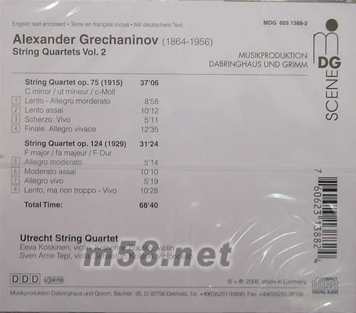 由四名弦樂(lè)精英組成之UTRECHT STRING QUARTET 演繹作曲家GRACHANINOV兩首弦樂(lè)四重奏,以瑰麗的弦樂(lè)獻(xiàn)奏出豐富的內(nèi)容,通透自然的音色,靚絕的弦樂(lè)令人著迷.