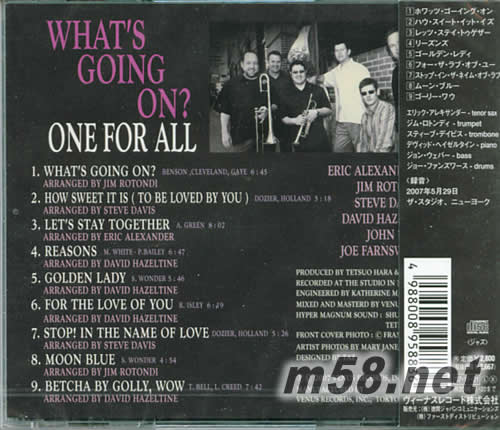 都會(huì)情景-One For All(m58.net) 由Eric Alexander,steve Davis及David Hazeltine等組成之One For All演繹多首精彩作品,爽朗的情懷傾而下,悅耳流暢的旋律令人雀躍,紐約頂級錄制,靚聲至極.