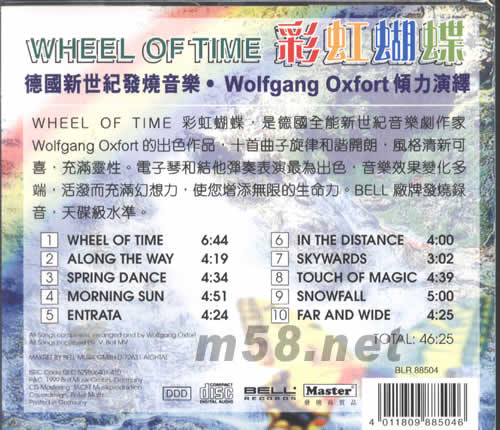 價(jià)格為估,以實(shí)到貨為準(zhǔn)! 彩虹蝴蝶(m58.net) 請(qǐng)點(diǎn)看產(chǎn)品正、背面大圖 WHEEL OF TIME 彩虹蝴蝶,是德國(guó)全能新世紀(jì)音樂劇作家Wolfgang Oxfort的出色作品,十首曲子旋律和諧開朗,風(fēng)格清新可喜,充滿靈性。電子琴和結(jié)他彈奏表演最為出色,音樂效果變化多端,活潑而充滿幻想力,使您增添無限的生命力。BELL 廠版發(fā)燒綠音,天碟級(jí)水準(zhǔn)。