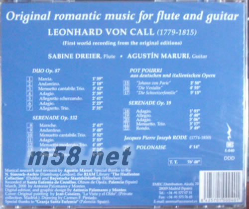 發燒長笛·結他 世界首度錄音精品(m58.net) 這一張不可多得的佳作。在聆聽Sabine和Agustin兩位大師用長笛和結他演奏十八世紀作曲家Leonhard Von Call的四首作品時,就仿佛隨著笛子和弦動發出的音韻,感受到從俗世藩籬釋放了自己,朝著大自然奔去,除了清風送爽外,耳邊還傳來一陣陣逍遙自在的樂韻,自由、愜意、浪漫,忘記煩器