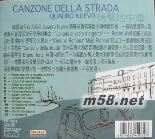 情系地中海(m58.net) CANZONE DELLA STRADA ─ QUADRO NUEVO 情系地中海 德國著名四人組合 Quadro Nuevo 演繹多首充滿地中海情懷作品,一段段浪漫醉人旋律奏和著這個如天堂殷的樂土。 "La luna si veste d'argento" 中,Robert Wolf 的醉人結他引出柔揚的小提琴令人傾心。 "Chitarra Romana" Mulo Francel 吹出了一個開懷的假日旅程。主題曲 "Canzone della strada" 取材自意大利西西里的陽光與碧海,令人忘郄煩憂。壓軸由鋼琴家 Bruno Renzi 自彈自唱出了一首無敵的醉人意大利情歌來結束這個意大利柔情假日。德國著名發燒品牌 GLM 的出品每屬佳作,繼多張上榜天碟后,這張專輯的樂器定位,空間感等皆屬天碟級數,不容錯過。