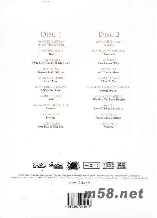 DISC 1 1.RENEE OLSTEAD a love that will last 2.JOANNA WANG true 3.ANN SALLY only love can break my heart 4.TIPITINA dream a little a dream 5.AIZA SEGUERRA open arms 6.YOSKIKA KITANAMI i wish you love 7.JULIET PANG smile 8.CARMEN CUESTA-LOEB dreams 9.NINA VIDAL driving 10.ZITA ZALAI one day in your life DISC 2 1.RACHELLE ANN love me 2.MALENE MORTENSEN desperado 3.NINA dont know why 4.SMOMA aintno sunshine 5.ANGELITALI close to yo 6.CATHY-ANNE MCCLINTOCK strongenough 7.ZSA ZSA PADILLA the way you look tonight 8.JEW love will lead you back 9.ANGELA doesnt really matter 10.RAKI VEGA memory