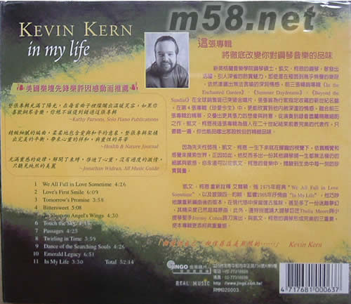 珍愛今生(m58.net) 一張從心底觸動靈魂感官的鋼琴音樂 他的雙眼幾乎看不見,但是,他的音樂卻意外地澄清剔透… 新英格蘭音樂學院鋼琴碩士,凱文‧柯恩的鋼琴,散發出活躍、引人深省的聆賞魅力,因為先天性弱視,凱文‧柯恩一生下來就在朦朧的視覺下,依靠觸覺和感覺來摸索世界,正因如此,他反而多出一份其他鋼琴師一生都無法模仿的細膩與敏感,前三張暢銷專輯《In the Enchanted Garden》、《Summer Daydreams》、《Beyond the Sundial》在全球銷售皆已突破金唱片,在第4張專輯《珍愛今生》交疊出更具張力的想像與詩意,只要聽一遍,你也能品嚐出那股脫俗的精致品味。