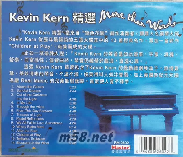 Kevin Kern 精選MORE THAN WORDS 新世紀純音樂(m58.net) “KEVIN KERN精選”是來自“綠色花園”創作演奏者,鼎鼎大名鋼琴大師KEVIN KERN從歷年最暢銷的五張大碟其中的13首經典名作,再加一首新作“CHILDREN AT PLAY”,結集而成的天碟 正如一眾樂評人說:[KEVIN KERN的琴音是如此優美、平易、浪漫、舒泰、而富感性;盡管曲終,琴音仍繞縈于腦海,真透心扉]。 這張KEVIN KERN精選包含了KEVIN KERN的最動聽鋼琴曲子,感情真摯,美妙清晰的琴音,不溫不燥,俊美得叫人如沐春風,加上美國新紀元天碟名廣REAL MUSIC的完美無瑕綠制,肯定使人愛不釋手。 來自五張鋼琴音樂的精粹 十四首動聽名曲首首難忘 旋律浪漫優美典雅 音色鏗鏘結像一流
