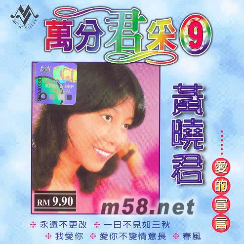 萬分君采9(m58.net) 這是一張比較特別的專輯,目前,有許多男女很想追求愛情,可是又很含蓄,不知怎樣向意中人表達內心的情感,如果有一天,您真的遇到了,千萬不要不知所措,感到如何適從,送她或送他這張專輯,就能夠充分表露出您內心的情感。里面的每一首歌都是精挑細選,都是向意中人細訴心聲的。像"永遠不更改","我愛你","幸福的花園","一日不見如三秋","愛到永久","永遠不會變","盟約","情意綿綿"等,由黃曉君的歌聲來為您表達您心中想說的話,讓感情更進一步的發展,開花結果。用黃曉君的歌聲來傳達您的愛慕,讓對方來體會,可能有事半功倍之效呢!