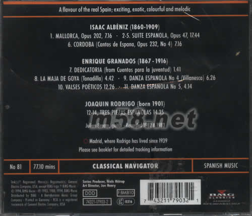LSAAC ALBENIZ (1860-1909) 1.MALLORCA,OPUS 2-5.SUITE ESPANOLA,OPUS 6.CORDOBA(CANTOS DE ESPANA,OPUS 232,NO 4) 7.DEDICATORIA (FROM CUENTOS PARA LA JUVENTUD) 8.LA MAJA DE GOYA (TONADILLA) 9.DANZA ESPANOLA NO 4(VILLANESCA) 10.VALSES POETICOS 11.DANZA ESPANOLA NO 5 JOAQUIN RODRIGO (BORN 1901) 12-14.TRES PIEZAS ESPANOLAS