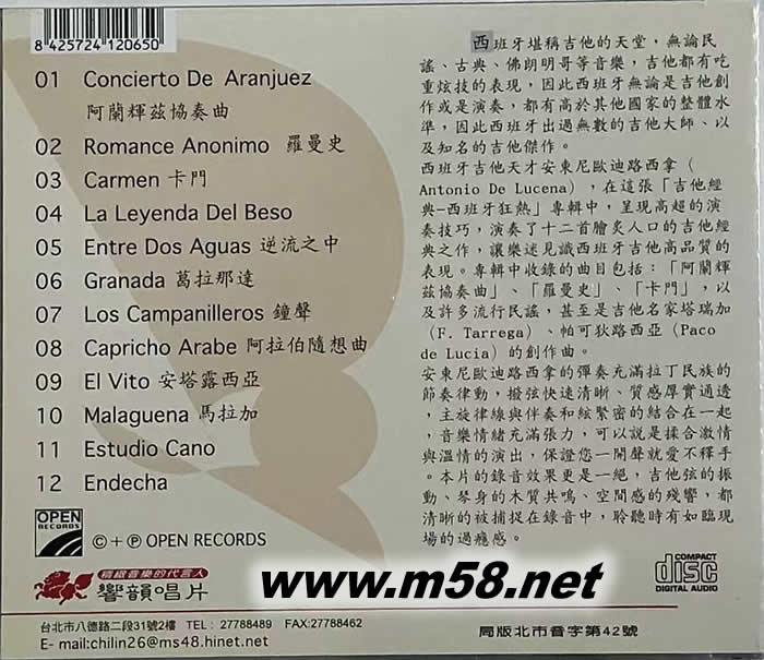 價格為估,以實到貨為準! GUITARRA CLASICA ESPANOLA 吉他經(jīng)典 西班牙狂熱 ANTONIO DE LUCENA(m58.net) 十二首膾炙人口的西班牙吉他經(jīng)典 音樂情緒中充滿張力及拉丁民族的節(jié)奏律動 讓你聆聽時有如臨現(xiàn)場的過癮感。 西班牙堪稱吉他的天堂,無論民謠、古典、佛朗明哥等音樂,吉他都有吃重炫技的表現(xiàn),因此西班牙無論是吉他創(chuàng)作或是演奏,都有高于其他國家的整體水準,因此西班牙出過無數(shù)的吉他大師、以及知名的吉他杰作。西班牙吉他天才安東尼歐迪路西拿(Antonio De Lucena),在這張“吉他經(jīng)典-西班牙狂熱”專輯中,呈現(xiàn)高超的演奏技巧,演奏了十二首膾炙人口的吉他經(jīng)典之作,讓樂迷見識西班牙吉他高品質(zhì)的表現(xiàn)。專輯中收錄的曲目包括:“阿蘭費茲協(xié)奏曲”、“羅曼史”、“卡門”,以及許多流行民謠,甚至是吉他名家塔瑞加(F. Tarrega)、帕可狄路西亞(Paco de Lucia)的創(chuàng)作曲。安東尼歐迪路西拿的彈奏充滿拉丁民族的節(jié)奏律動,撥弦快速清晰、質(zhì)感厚實通透,主旋律線與伴奏和絃緊密的結(jié)合在一起,音樂情緒充滿張力,可以說是揉合激情與溫情的演出,保證您一開聲就愛不釋手。本片的錄音效果更是一絕,吉他弦的振動、琴身的木質(zhì)共鳴、空間感的殘響,都清晰的被捕捉在錄音中,聆聽時有如臨現(xiàn)場的過癮感。 (2)西班牙吉他天才‘安東尼歐迪路西拿’繼銷暢專輯【西班牙狂熱】后又一力作 西班牙風情中總是伴隨著【卡門】慾望的身影、吉普賽人的流浪及熱情音符中的吉它聲,而西班牙音樂也總是與拉丁節(jié)奏及古巴旋律有著密不可分的關(guān)係 繼上張銷暢金碟‘西班牙狂熱’后,天才吉它手安東尼歐再次推出以西班牙為背景,經(jīng)典名曲為主題的【愛在西班牙】專輯,從開場曲古巴作曲家Pubuco的名作‘白鴿頌’開始,耳熟能詳?shù)臉芬艟鸵砸环N輕快浪漫的異國風情入侵聽覺,在吉它高低音部和諧的唱和聲中,樂手出神入化的演奏技巧一點也不會比這些名曲本身遜色。百聽不厭的情歌‘AMOR’在鮮明旋律及活潑節(jié)奏的鼓動下,把愛情中的甜蜜喜悅之情刻劃的十分生動。 而古巴‘關(guān)達拉美拉’及西班牙‘吻我多一些’這些千古名曲,在安東尼歐感情豐沛、韻味十足的撥弦下,配合著拉丁打擊樂器的耀動讓人不由得跟著打起拍子,滿溢歡欣之情。不僅是樂手本身高超的吉它技巧或這些經(jīng)典名曲的順耳,本專輯在錄音方面也是十足用心,結(jié)構(gòu)層次分明的打擊樂器部、吉它音箱細微的共振感及迴盪在空間中的聲響,你都可以在錄音中一一清楚的分辨及感受他們給你的動感。