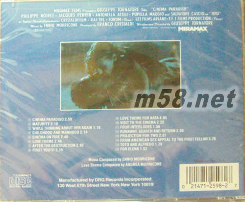 新星光伴我心 天堂電影院CINEMA PARADISO(m58.net) 新星光伴我心 獲得1989年度最佳外語片.電影原聲大碟于首度發(fā)行時便成為暢銷盤,全機關(guān)報推出限量發(fā)行版.錄音難沒說明有什么改進.但一播放,不須有什么專業(yè)器材和知識,都不難發(fā)現(xiàn)錄音比前靚,空間感及清晰度俱佳.還額外附送一曲Cinema paradisco弦樂版.