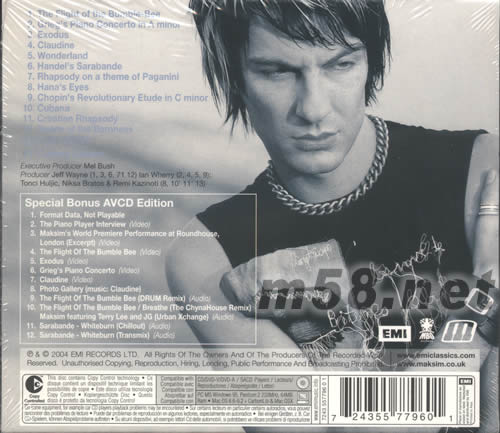 1、THE FLIGHT OF THE BOMBLE-BEE 2、GRIEG‘S PIANO CONCERTO IN A MINOR 3、EXODUS 4、CLAUDINE 5、WONDERLAND 6、HANDEL’S SARABANDE 7、RHAPSODY ON A THEME OF PAGANINI 8、HANA‘S EYES 9、CHOPIN’S REVOLUTIONARY ETUDE IN C MINOR 10、CUBANA 11、CROATIAN RHAPSODY 12、DANCE OF THE BARONESS SPECIAL BONUS AVCD DETION 1、FORMAT DADA,NOT PLAYABLE 2、THE PIANO PLAYER INTERVIEW(VIDEO) 3、MAKSIM‘S WORLD PREMIERE PERFORMANCE AT ROUNDHOUSE,LONDON(EXCERPT)(VIDEO) 4、THE FLIGHT OF THE BUMBLE BEE(VIDEO) 6、GRIEG’S PIANO CONCERTO(VIDEO) 7、CLAUDINE(VIDEO) 8、PHOTO GALLERY (MUSIC:CLAUDINE) 9、THE FLIGHT OF THE BUMBLE BEE (DRUM REMIX)(AUDIO) 10、THE FLIGHT OF THE BUMBLE BEE/BREATHE (THE CHYNAHOUSE REMIX) MAKSIM FEATURING TERRY LEE AND JG(URBAN XCHANGE)(AUDIO) 11、SARABANDE WHIGEBURN(CHILLOUT)(AUDIO) 12、SARABANDE WHITEBURN(TRANSMIX)(AUDIO)
